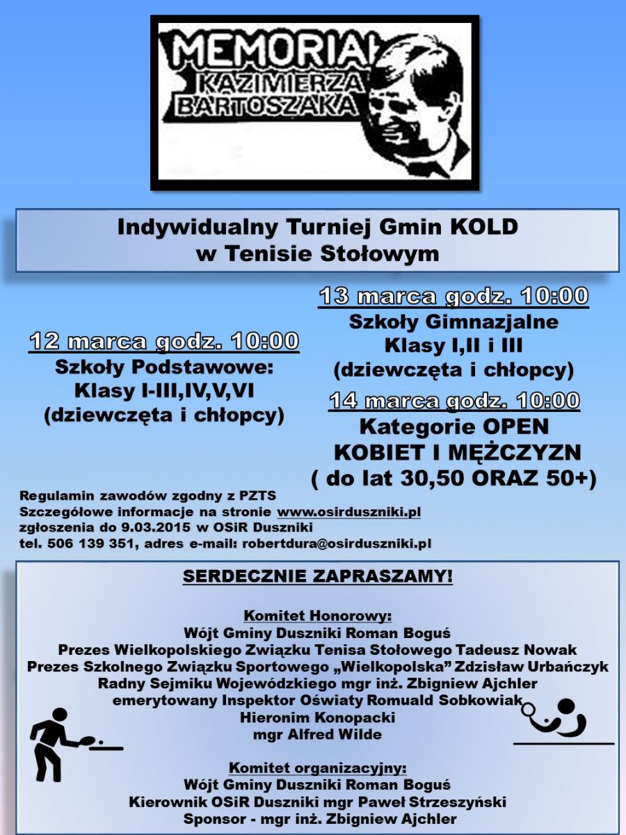 Zapraszamy do wzięcia udziału w Turnieju Tenisa Stołowego, który odbędzie się w dniach 12-14 marca 2015. Aby zapoznać się ze szczegółami Turnieju otwórz plakat.